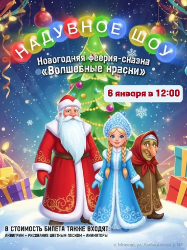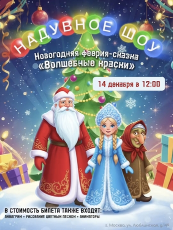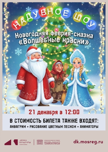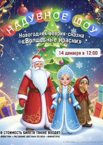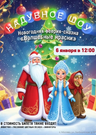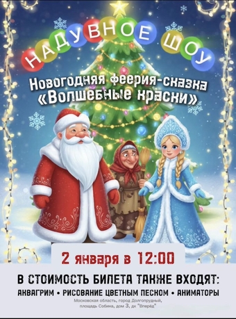 Новогодняя феерия-сказка «Волшебные краски» - Это увлекательное представление не оставит никого равнодушным, потому что каждого здесь ждет сюрприз. Еще до начала спектакля герои сказки разукрасят лица всех желающих разноцветными красками. А чтобы