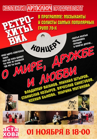 В концерте принимают участие экс-солисты и музыканты легендарных ВИА 70-80х годов, чьи голоса не покидают хит-парады отечественного радиоэфира. Все исполняемые ими песни без исключения узнаваемы по первым аккордам и первым строчкам! Профессионализм и душевность этих артистов - составные части концерта, который подарит заряд положительной энергии и позитив, а также потрясающие незабываемые эмоции!!!